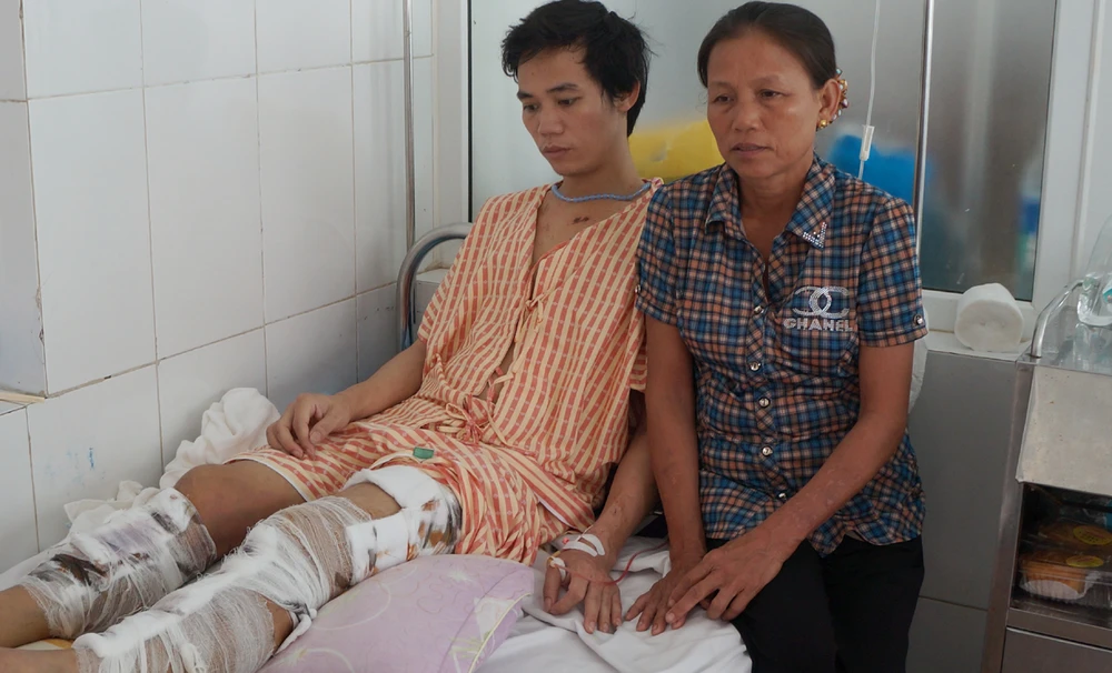 Người thân đang chăm sóc, động viên anh Nguyễn Hữu Minh (27 tuổi, trú xã Đại Sơn, huyện Đô Lương, Nghệ An) đang cấp cứu, điều trị tại Bệnh viện 115 Nghệ An. Như đã đưa tin, sáng 2-6, một tai nạn giao thông đặc biệt nghiêm trọng đã xảy ra ở huyện Kaeng Khro, tỉnh Chaiyaphum (vùng Đông Bắc Thái Lan). Xe khách chở 15 công nhân Việt Nam đi sai làn đường đã đâm trực diện vào một xe tải chở đầy sắn. Vụ tai nạn làm 12 người Việt Nam (quê Nghệ An, Hà Tĩnh, Đồng Nai) và một tài xế Thái Lan chết tại chỗ, 3 người Việt bị thương nặng. Thời gian qua, do xác 11 nạn nhân bị cháy, biến dạng nên phải chờ cơ quan có thẩm quyền của Thái Lan xác định ADN. Trong số 3 người bị thương, anh Nguyễn Hữu Minh (27 tuổi, trú xã Đại Sơn, huyện Đô Lương, Nghệ An) đã được đưa về cấp cứu tại BV 115 Nghệ An (TP Vinh), hai người còn lại đang cấp cứu, điều trị tại Thái Lan.