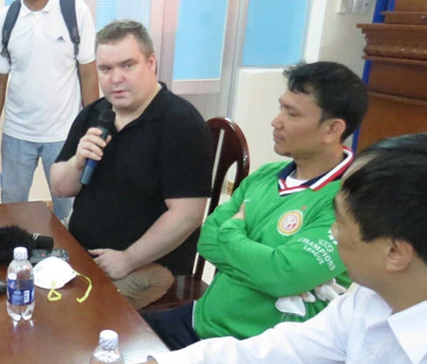 Bếp trưởng tàu Bulk Jupiter (khoanh tay) và đại diện chủ tàu tại Vũng Tàu chiều 4-1. Ảnh: TK