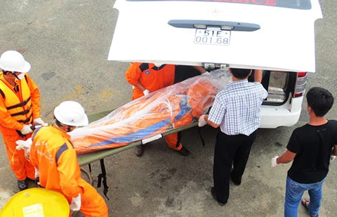 Đưa thi thể nạn nhân lên xe cứu thương để làm thủ tục đưa về nước. Ảnh: T.CƯỜNG