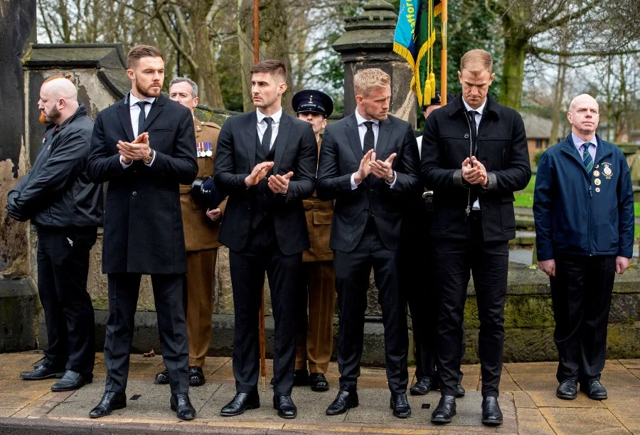 Những “hậu bối” của thủ môn huyền thoại Anh như Joe Hart, Jack Butland, Kasper Schmeishel, Joe Anyon khiêng chiếc quan tài ướp thi thể Gordon Banks ra xe.