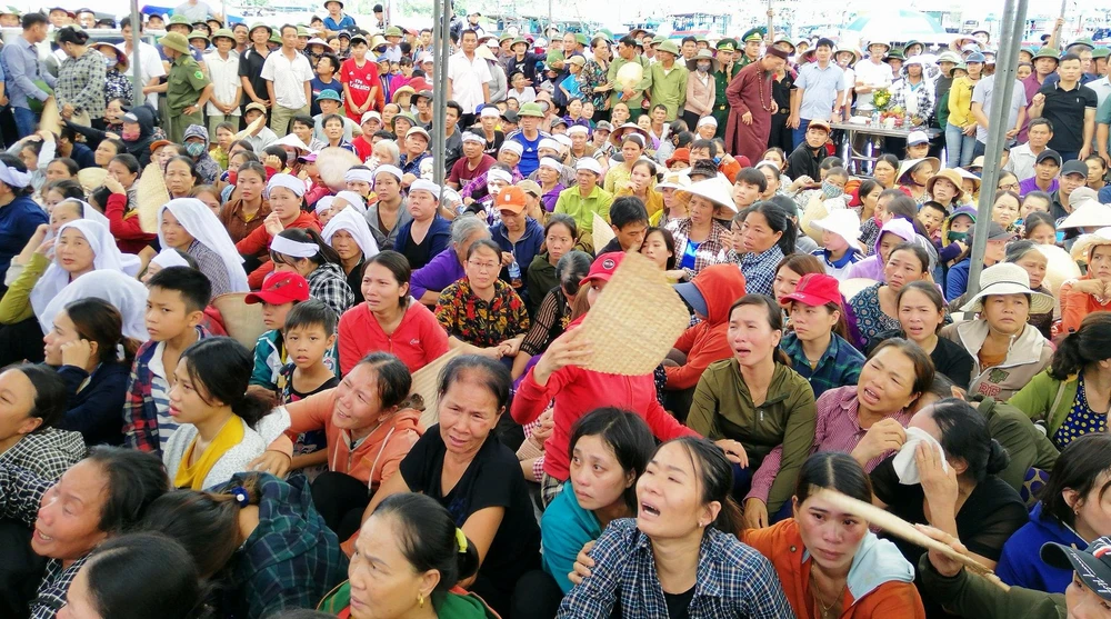 Rất đông người thân, người dân đến dự lễ cầu hồn chín ngư dân ở xã Tiến Thủy đang mất tích trên biển.