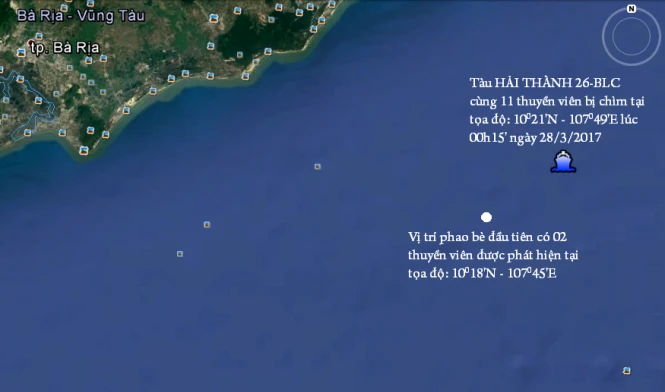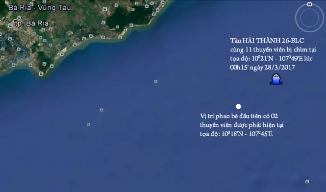 Hiện tàu Hải Thành 26 được xác định cách nơi xảy ra tai nạn gần hai hải lý, độ sâu 32 m dưới biển, cách Vũng Tàu khoảng 46 hải lý.