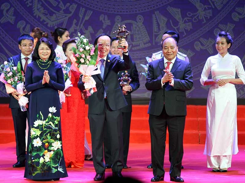 Thủ tướng Nguyễn Xuân Phúc trao tặng cúp Thánh Gióng cho các doanh nhân tiêu biểu tại lễ phát động phong trào thi đua với chủ đề “DN Việt Nam hội nhập và phát triển” vừa diễn ra nhân ngày Doanh nhân Việt Nam 13-10. Ảnh: TTXVN