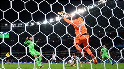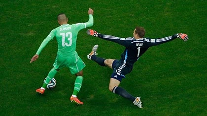 Trong hiệp 1, ít nhất 3 lần thủ thành Neuer buộc phải băng lên cản phá bóng ngay trong chân cầu thủ Algeria. Đáng kể nhất là tình huống thoát xuống bên cánh trái của Slimani, nếu thủ thành Neuer không xử lý chính xác khi kịp băng ra cản phá bóng ngay trong chân Slimani, lưới của tuyển Đức chắc chắn đã không thể toàn vẹn.