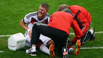 Cầu thủ hai đội liên tục nằm sân vì chuột rút. Schweinsteiger không còn đủ thể lực phải rời sân nhường chỗ cho Kramer Ảnh: FIFA.com