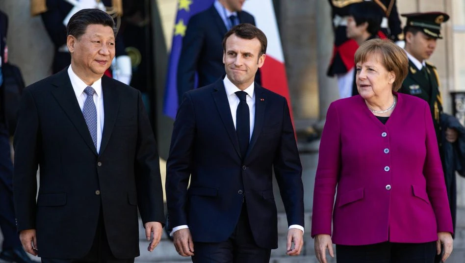 (Từ trái qua) Chủ tịch Trung Quốc Tập Cận Bình, Tổng thống Pháp Emmanuel Macron và Thủ tướng Đức Angela Merkel gặp mặt trong chuyến thăm Pháp chính thức của ông Tập vào tháng 3-2019. Ảnh: DW