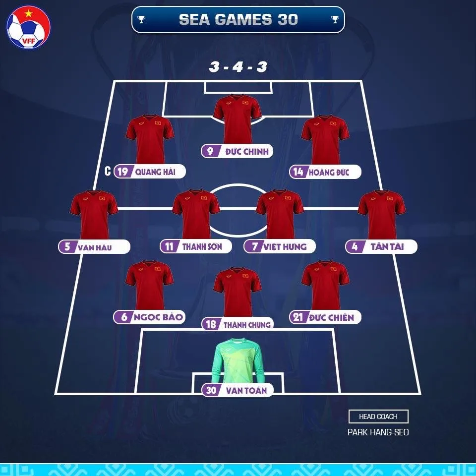 U-22 Việt Nam: Tiến Dũng, Tấn Sinh, Thành Chung, Văn Hậu, Thanh Thịnh, Tấn Tài, Trọng Hoàng, Hùng Dũng, Hoàng Đức, Quang Hải, Tiến Linh.