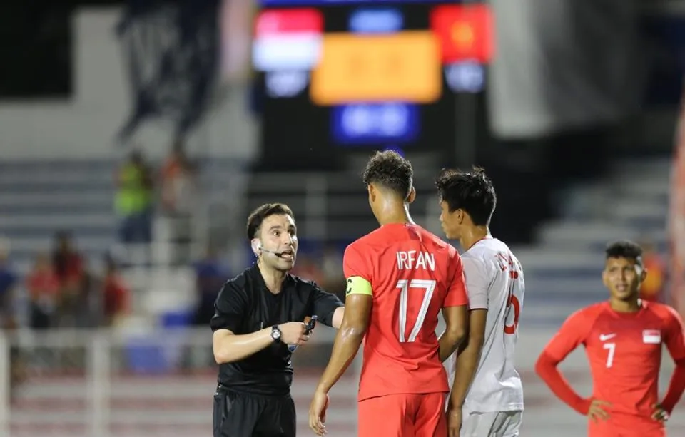 Phút 69, trọng tài vô tình ngăn cản pha giải nguy của cầu thủ U-22 Singapore giúp Đức Chinh cướp được bóng ngay trước vòng cấm. Tuy nhiên, trọng tài người Kuwait lại quyết định cắt còi ở tình huống này rất khó hiểu.