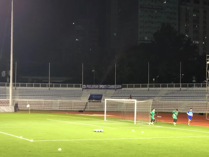Trước trận đấu các nhân viên đã cào nước đọng trên sân Rizal Memorial, trời thì cũng đã ngừng mưa.