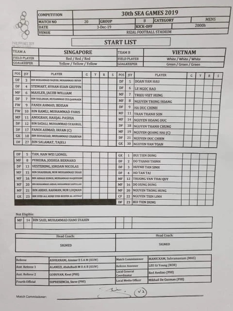 Ở trận đấu này, U-22 Việt Nam lần đầu xuất phát với trang phục toàn trắng. Trong khi đó U-22 Singapore ra sân với trang phục toàn đỏ.