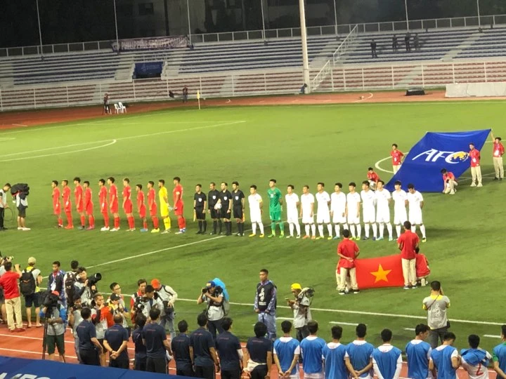 Hai đội làm lễ chào cờ và hát quốc ca trước trận đấu. Ảnh: CÔNG TUẤN