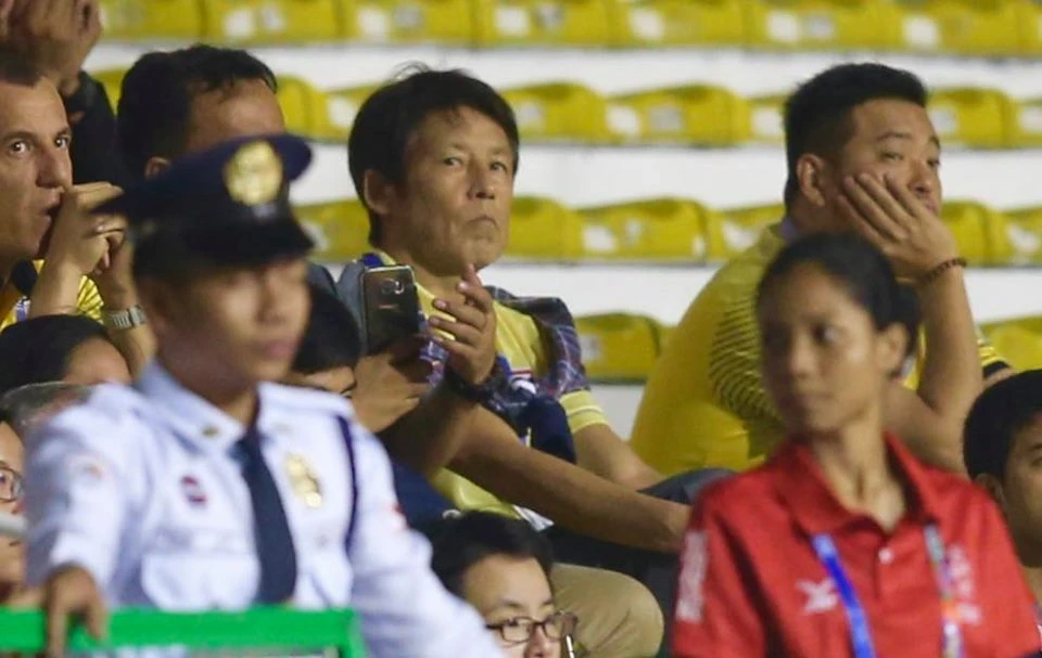 HLV Nishino của U-22 Thái Lan có mặt trên khán đài theo dõi trận đấu.