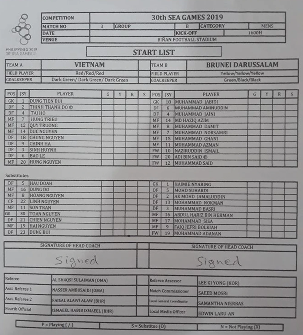 Trọng tài Al Shaqsi Sulaiman thổi còi kết thúc trận đấu. Kết quả chung cuộc, U-22 Việt Nam (VN) giành chiến thắng 6-0 trước U-22 Brunei trong trận mở màn bảng B SEA Games 30.