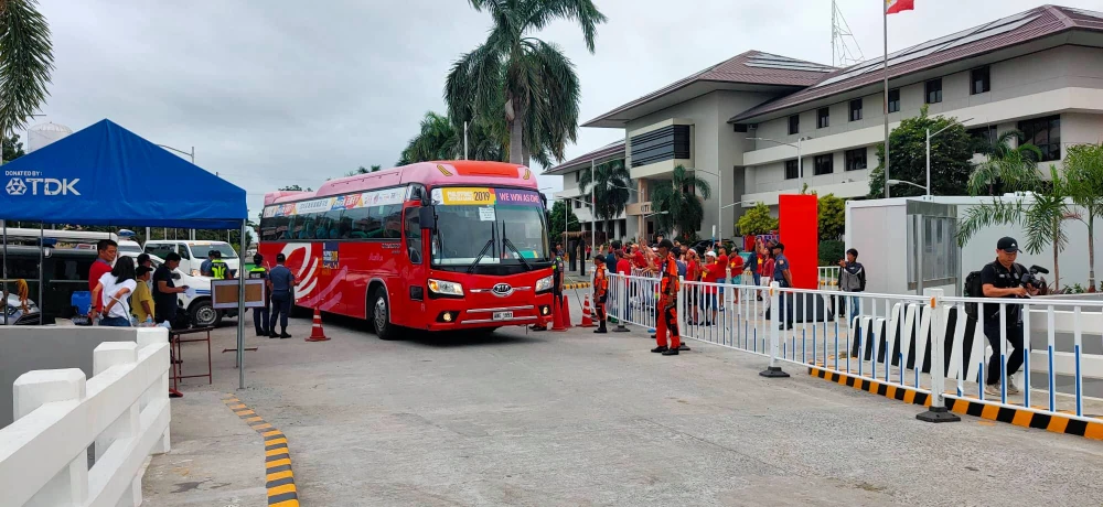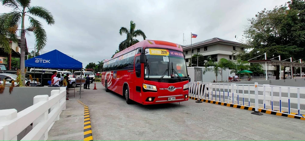 Xe chở các cầu thủ U-22 Việt Nam tiến vào sân.