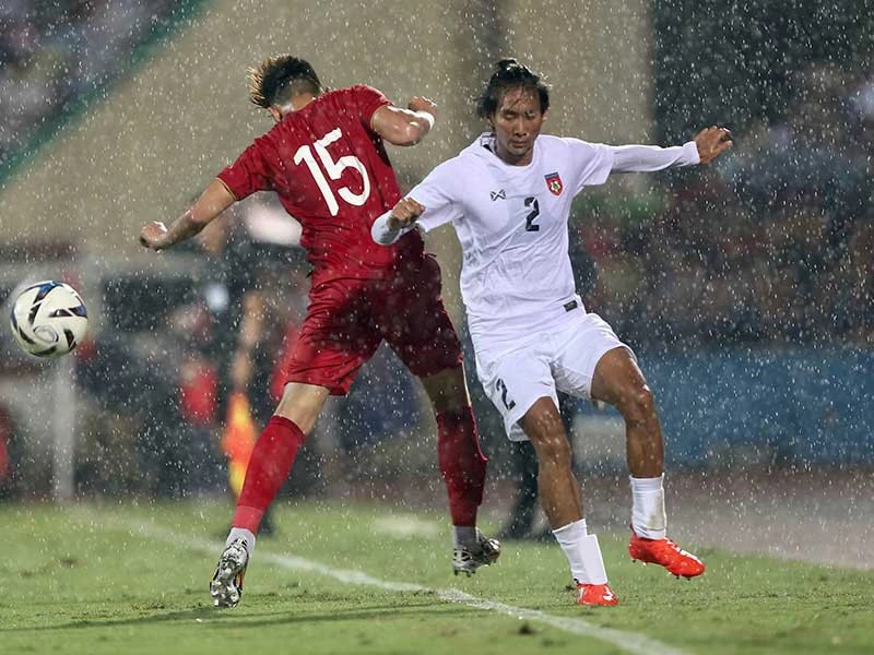 Phút 29, Đức Chinh bị đau nằm trên sân sau pha va chạm với Muhammad Jaini.