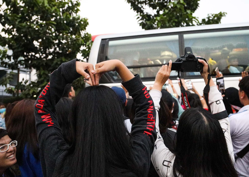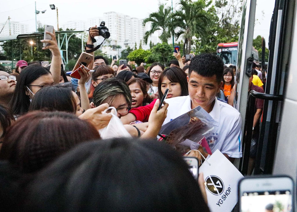 Đức Chinh bị fan hâm mộ vây quanh xin chữ ký.