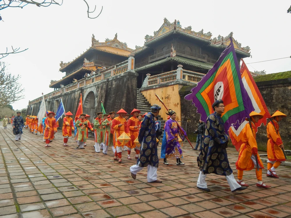 Cây nêu được đoàn rước qua trước cổng Ngọ Môn. Ảnh: NGUYỄN DO