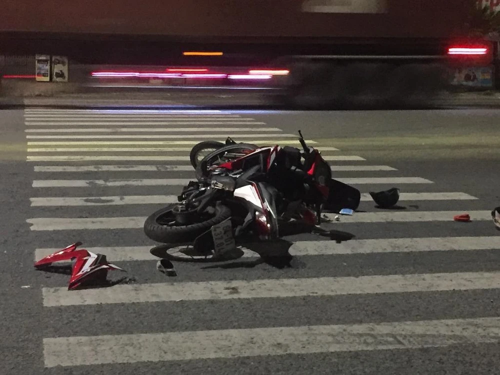 Cùng lúc, xe máy 64D1-437.84 do một nam thanh niên lái với tốc độ cao từ phía sau đã va chạm mạnh vào xe của hai vợ chồng. Cả ba người trên hai xe văng xuống đường, bị thương nghiêm trọng, phải nhập viện cấp cứu.