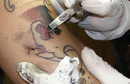 Anh N. mang găng cả hai tay, máy xăm cũng được bọc trong một lớp nylon. Nước mô (nằm dưới lớp da) và máu rỉ ra từ vết xăm được liên tục lau bằng bông gòn có tẩm một thứ hóa chất mà theo chủ tiệm vừa có tác dụng làm sạch vết mực lem vừa khử trùng vết xăm.