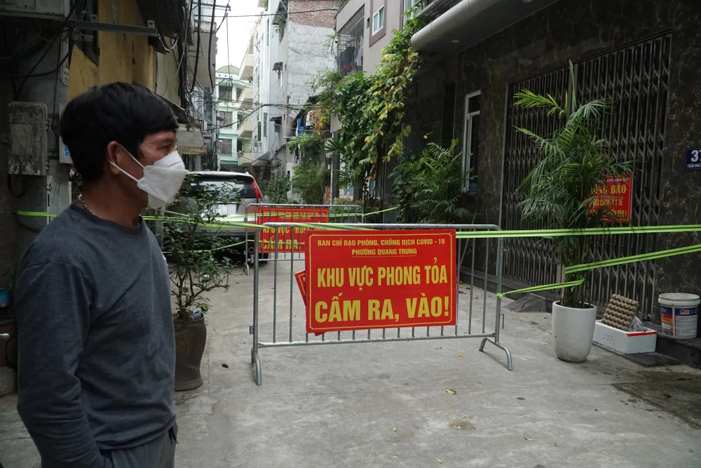 Một khu vực phong tỏa do có trường hợp mắc COVID-19 tại Hà Nội. ẢNH: PHI HÙNG