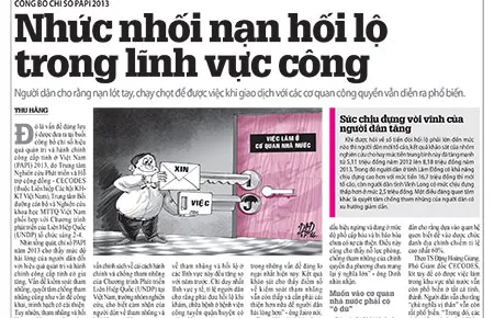 Buổi công bố chỉ số hiệu quả quản trị và hành chính công cấp tỉnh ở Việt Nam (PAPI) 2013 đưa ra thông tin: Nạn hối lộ trong lĩnh vực công vẫn đang nhức nhối (xem Pháp Luật TP.HCM ngày 3-4). Nhiều bạn đọc bức xúc cho rằng không thể kéo dài vấn nạn này và đề xuất một số giải pháp.