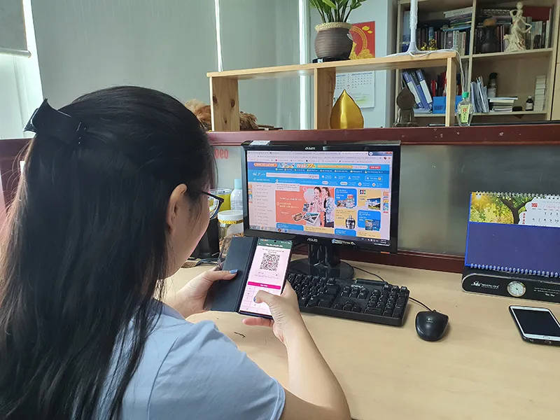 Khách hàng đang thực hiện giao dịch thanh toán qua ví điện tử Momo. Ảnh: T.LINH