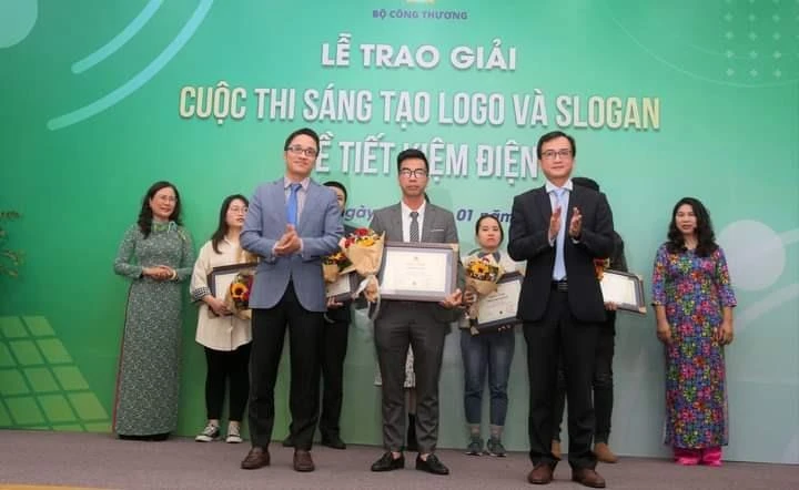 Đại diện EVN và Bộ Công Thương trao thưởng cho các tác giả đoạt giải cuộc thi Sáng tạo logo và slogan về tiết kiệm điện. Ảnh: BCT