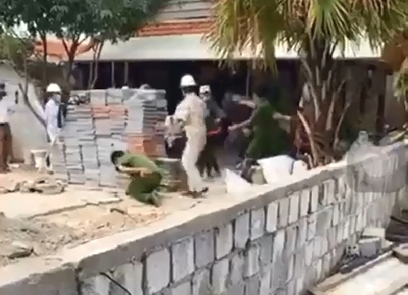 Lúc này, xuất hiện một nhóm người xăm trổ ra cự cãi, dùng gạch đá tấn công lực lượng làm nhiệm vụ khiến hai người bị thương. Sau đó, công an phải huy động thêm lực lượng để khống chế.