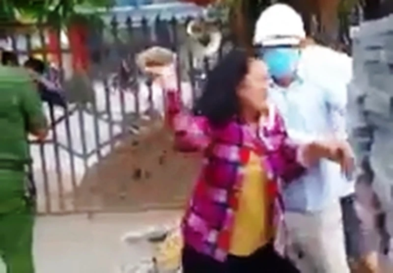 Một phụ nữ cầm đá ném về phía lực lượng chức năng. Ảnh: Cắt từ clip