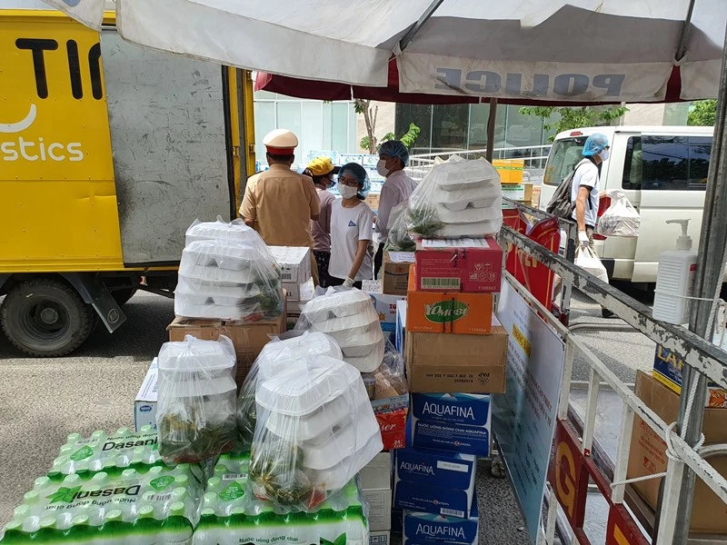 Nhiều mạnh thường quân hỗ trợ nhu yếu phẩm, thực phẩm... trực tiếp tại nơi cách ly, phong tỏa ở Đà Nẵng. Ảnh: TẤN VIỆT