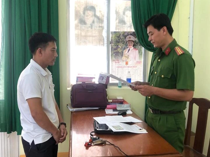 Công an đọc lệnh bắt tạm giam bị can Ngô Quốc Trung. Ảnh: CA
