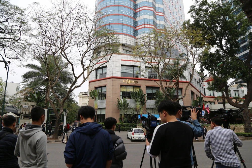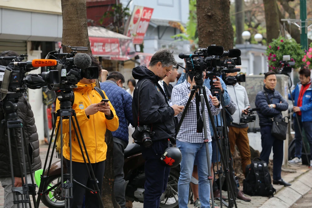 Đông đảo phóng viên trong và ngoài nước túc trực phía bên đường, đối diện khách sạn để tác nghiệp.