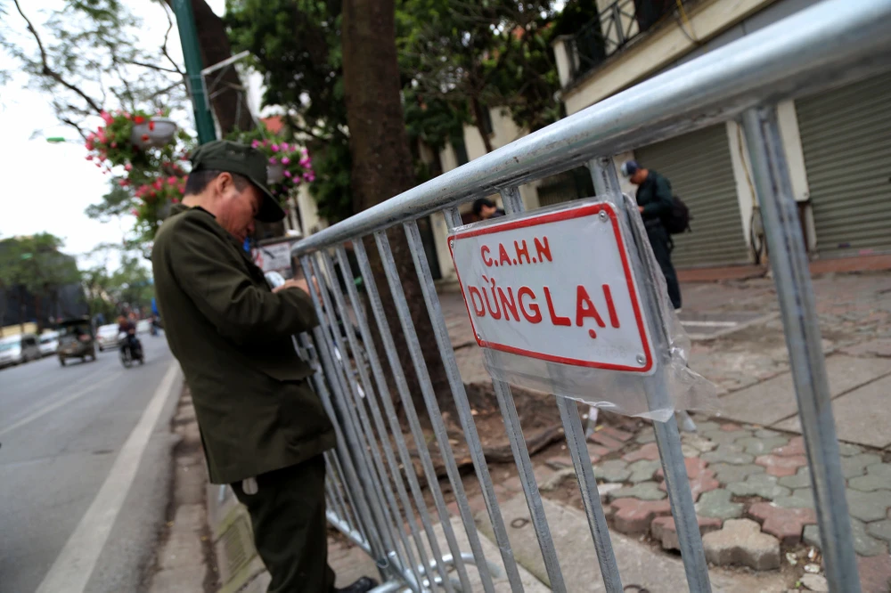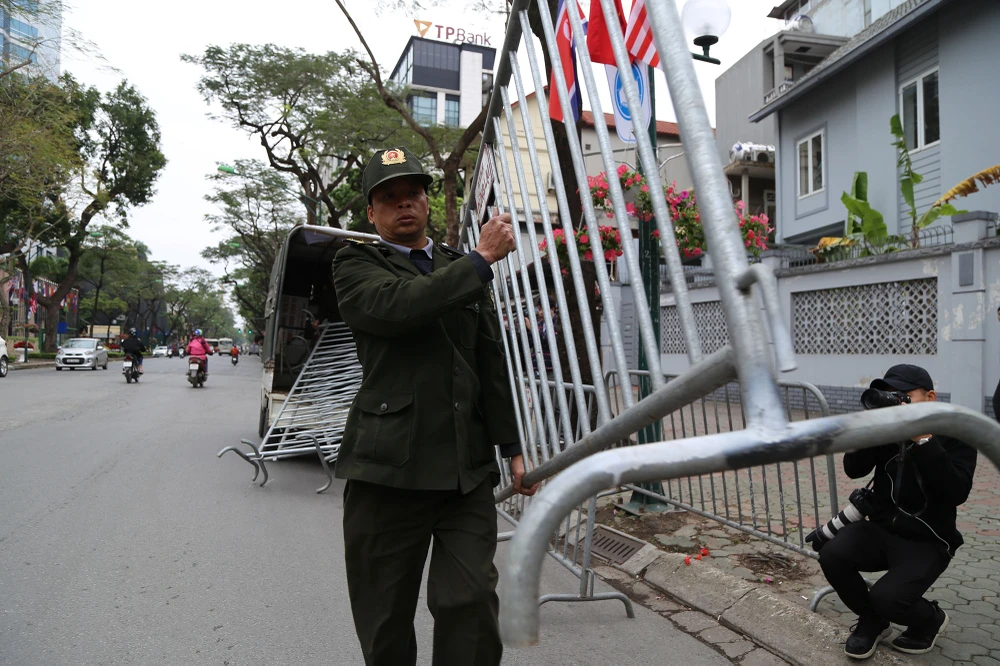 Công an phường Trần Hưng Đạo, quận Hoàn Kiếm tiến hành dựng hàng rào sắt bao quanh vỉa hè đường Lý Thường Kiệt, trước khách sạn Melia, lắp đặt thêm pano sự kiện thượng đỉnh Mỹ - Triều tại đầu ngã tư Lý Thường Kiệt – Thợ Nhuộm.