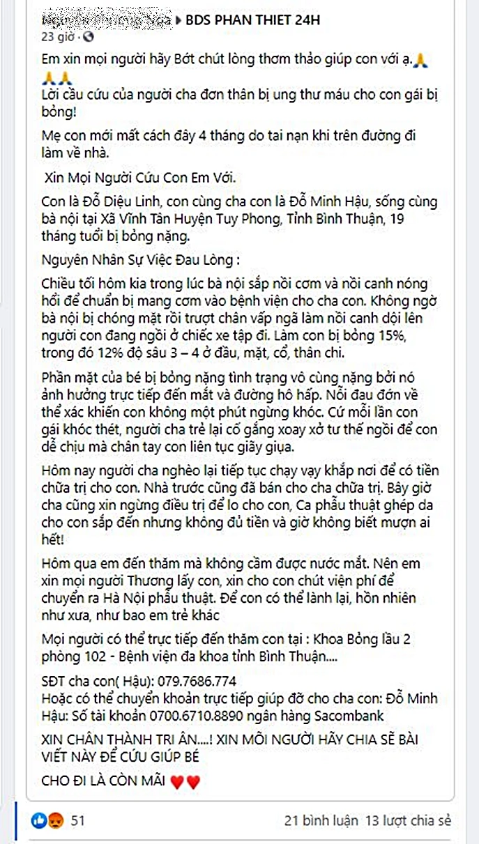 Xin mọi người cứu con em với. Con là Đỗ Diệu Linh, con cùng cha con là Đỗ Minh Hậu, sống cùng bà nội tại xã Vĩnh Tân huyện Tuy Phong, tỉnh Bình Thuận, 19 tháng tuổi bị bỏng nặng.
