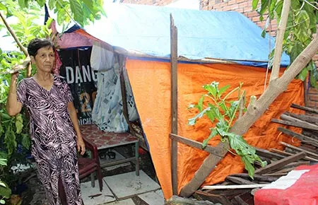 Bà Nguyễn Thị Lượm bên căn lều dựng tạm trên nền nhà cũ. Ảnh: H.LAN