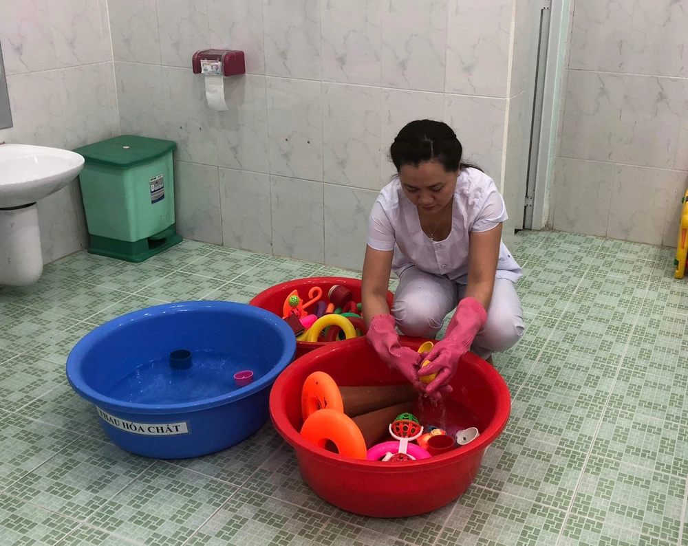 Giáo viên Trường Mầm non Hoàng Yến thực hành khử khuẩn đồ chơi của trẻ. Ảnh: HOÀNG LAN