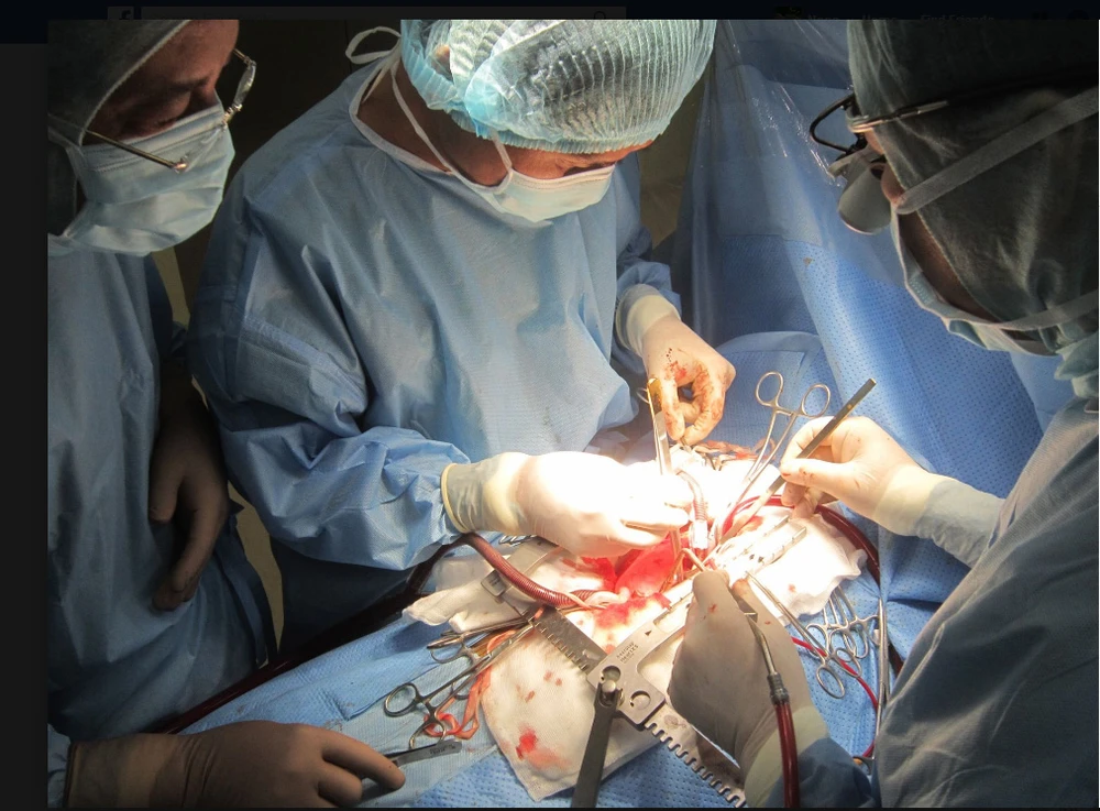 Các bác sĩ đang phẫu thuật tim hở cho bệnh nhân H. Ảnh: VĂN PHỤNG