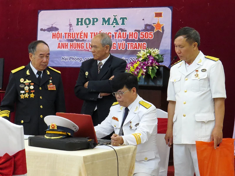 Đại tá Vũ Huy Lễ, Anh hùng lực lượng vũ trang, thuyền trưởng tàu HQ505 (bìa trái), trong một lần kỷ niệm trận chiến Gạc Ma năm 1988. Ảnh: PV