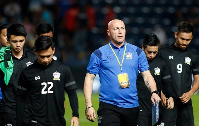 Thầy trò Jankovic của U-23 Thái Lan rời sân I-Mobile sau trận thua U-23 Việt Nam tại M-150 Cup