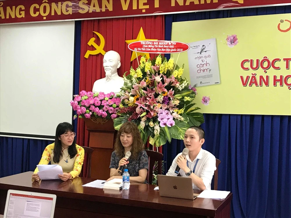 Nhà văn Eun Heekyung (giữa) trả lời câu hỏi của sinh viên tại ĐH KHXH&NV TP.HCM.