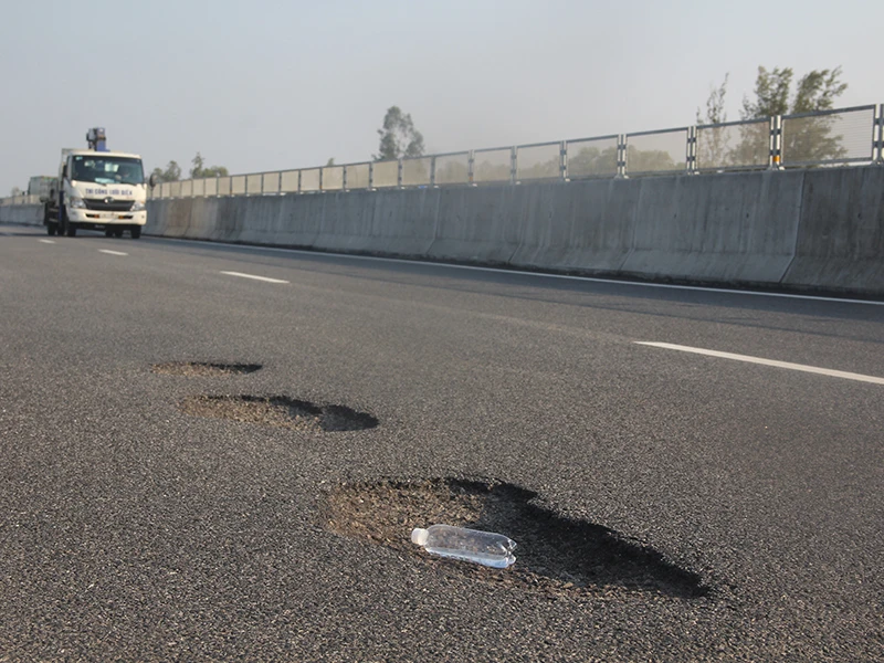 Những ổ gà lớn xuất hiện trên cao tốc Đà Nẵng-Quảng Ngãi. Ảnh: THANH HIẾU