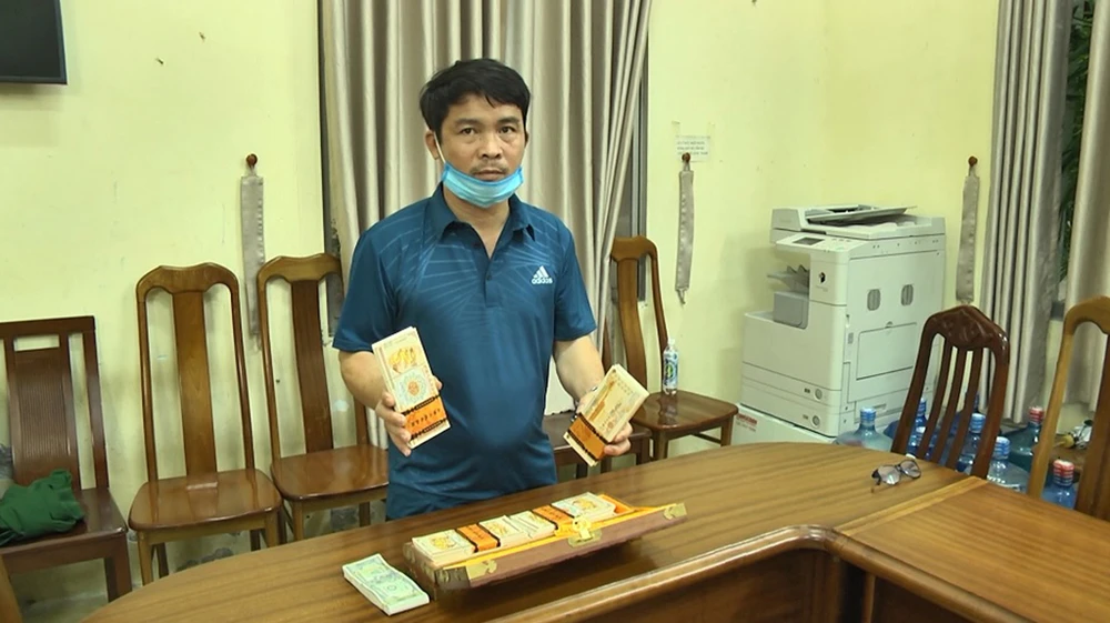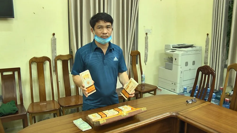 Tiến và tang vật là số tiền tang vật bị công an thu giữ. Ảnh CA