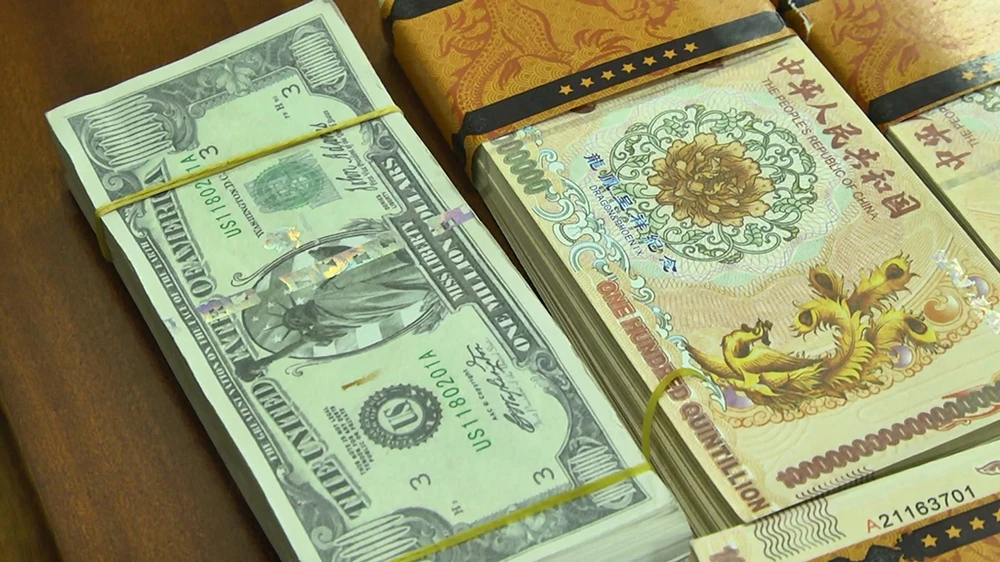 Nhóm lừa đảo dùng xấp tiền, trong đó mỗi tờ mệnh giá một triệu đô để nạn nhân tin tưởng. Ảnh CA