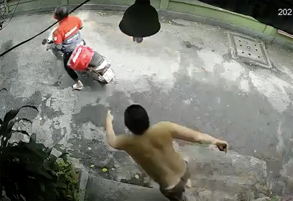 Lúc này, camera an ninh ghi lại hình ảnh hai nam thanh niên mặc trang phục xe ôm công nghệ điều khiển xe máy chạy ngang qua rồi bất ngờ vòng xe lại, chạy vào hẻm cụt bên cạnh nhà anh Q.