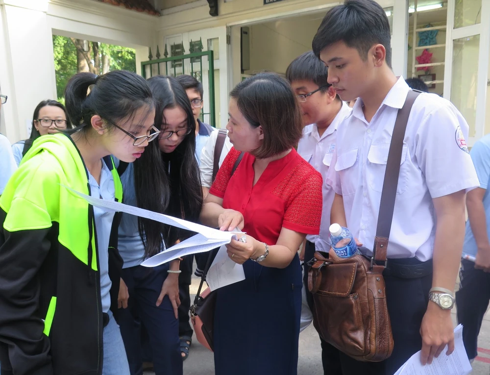 Cô trò trao đổi bài sau giờ thi tại kỳ thi THPT Quốc gia năm 2016