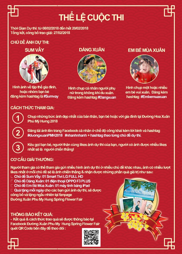 Như những năm trước, Hội hoa xuân Phú Mỹ Hưng là địa điểm vui chơi, tham quan, chụp ảnh và chia sẻ hình ảnh trên mạng xã hội của nhiều gia đình và các bạn trẻ mỗi dịp Tết đến. Năm nay, để những hình ảnh chia sẻ này có ý nghĩa hơn, được nhân rộng hơn, ban tổ chức đã phát động cuộc thi ảnh “Du xuân 2018” (từ ngày 8 đến 20-2). Chỉ cần chụp ảnh, đăng lên mạng xã hội theo đúng quy cách của cuộc thi là người tham gia có cơ hội nhận được lộc xuân may mắn là những giải thưởng rất có ý nghĩa cho gia đình, bạn bè, các em nhỏ như: smart tivi, smart phone, máy tính bảng…