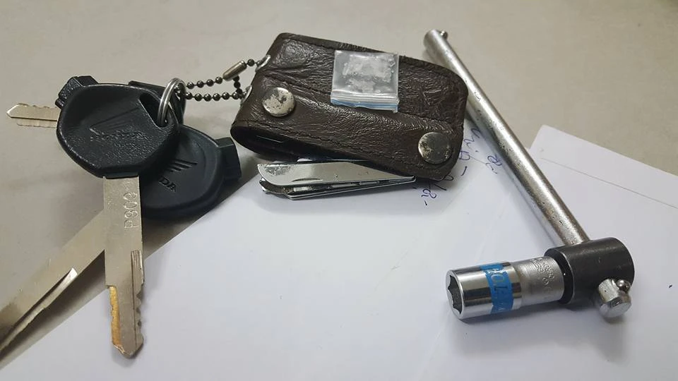 Tiến hành kiểm tra, lực lượng chức năng phát hiện trong người nam thanh niên có một gói nilon chứa chất tinh thể màu trắng (nghi là ma túy đá), một công cụ dùng để bẻ khóa xe máy. Ngoài ra, chùm chìa khóa xe của nam thanh niên này có nhiều loại khóa khác nhau và có những chiếc được mài vẹt cả hai đầu.