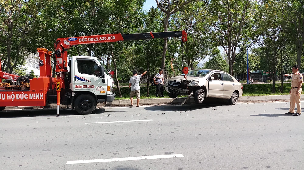 Sáng 7-5, ô tô bốn chỗ biển số TP.HCM do tài xế khoảng 35 tuổi điều khiển chạy trên đại lộ Mai Chí Thọ (phường An Phú, quận 2, TP.HCM).