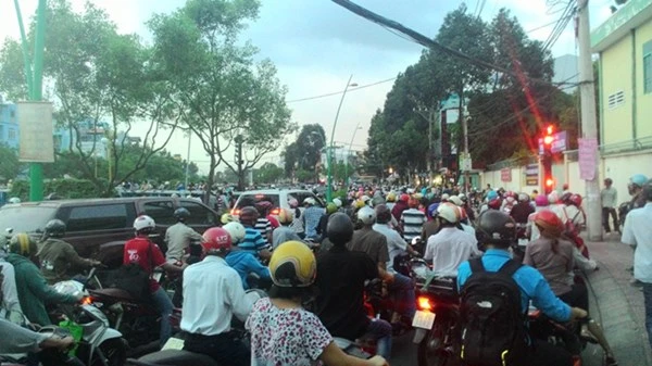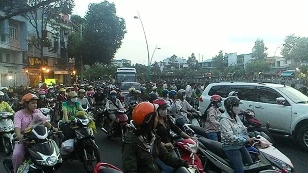 Giao thông ở hai hướng qua đoạn này kẹt cứng, lực lượng CSGT phải vất vả điều tiết các phương tiện. Ảnh Việt Văn.