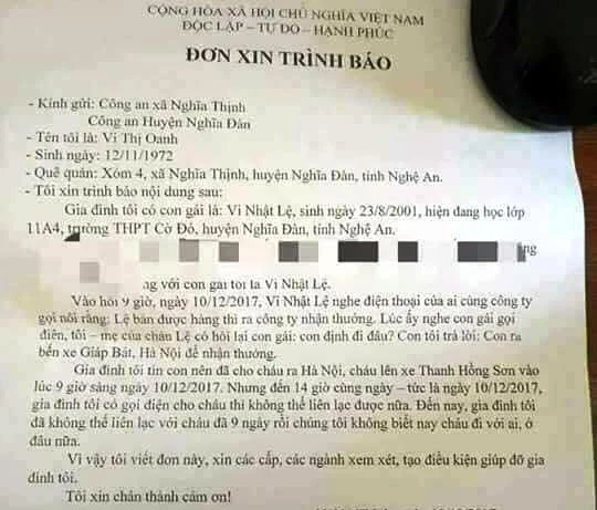 Theo đơn trình báo của chị Vo Thị Oanh (ở xóm 4, xã Nghĩa Thịnh): Lúc 9 giờ sáng 10- 12, em Lệ nhận được điện thoại của một người nói Lệ bán được hàng, ra công ty nhận thưởng. Chị Oanh có hỏi Lệ “con đi đâu?’, thì Lệ trả lời: Con ra bến xe Giáp Bát (Hà Nội) nhận thưởng.